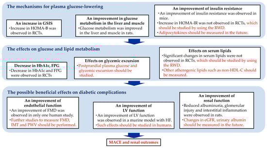 What are currently demonstrated and what should be elucidated in the future about the mechanisms of plasma glucose-lowering of imeglimin, the effects of imeglimin on glucose and lipid metabolism and the possible beneficial effects of imeglimin on diabetic complication. The description in black letters indicates what is currently being demonstrated, and the description in red letters indicate what should be elucidated in the future. eGFR, estimated glomerular filtration rate; GSIS, glucose-stimulated insulin secretion; FMD, flow-mediated vasodilation; FPG, fasting plasma glucose; HF, heart failure; HOMA-B, homeostatic model assessment of β-cell function; HOMA-IR, homeostasis model assessment-insulin resistance; IMT, intima-media thickness; LV, left ventricular; MACE, major adverse cardiovascular events; non-HDL-C, non-high-density lipoprotein cholesterol; PWV, pulse wave velocity; RCTs, randomized controlled trials; RWD, real-world data.