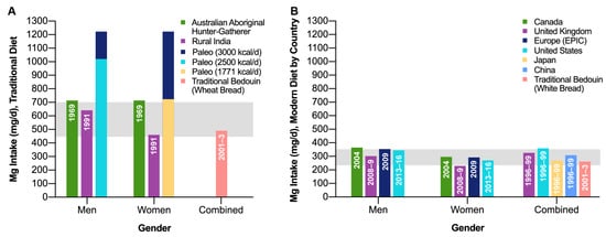 Comparison of mean dietary magnesium intakes among adults by diet type. (A) Traditional diet (450–700 mg Mg/day). (B) Modern diet (250–350 mg Mg/day). Shaded areas indicate range of mean adult Mg intakes of these various studies. Reprinted/adapted with permission from Rosanoff [] for source data (figure adapted with author permission).