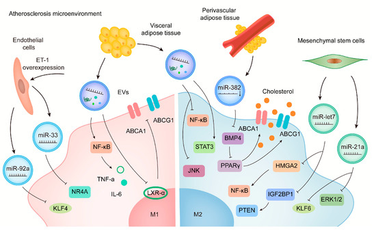 As obesity is one of the major causes of AS, EVs from adipose tissue (AT) play a significant role in obesity-associated metabolic complications as well as the progression of AS. EVs derived from visceral adipose tissue (VAT) can be absorbed by macrophages and promote foam cell production by reducing ABCA1-mediated cholesterol efflux in obese mice exposed to high-fat diets (HFD). VAT-EVs can also induce the secretion of TNF-a and IL-6, thereby inducing M1 phenotype, accompanied by increased phosphorylation of NF-κB. Intravenously administration of HFD-VAT-derived EVs significantly exacerbates the development of AS in ApoE−/− mice [47]. In addition, perivascular adipose tissue can release EVs (PVAT-EXO) to regulate inflammation and vascular homeostasis. According to Liu et al., patients with coronary heart disease (CHD) have lower levels of miR-382-5p content in PVAT-EXO. MiR-382-5p reduces the uptake of cholesterol by macrophages as well as the formation of foam cells via up-regulating the content of ATP-binding cassette transporter-A1 (ABCA1) and peroxisome proliferators-activated receptor-γ (BMP4-PPARγ) pathway [48]. MSC-derived EVs from adipose tissue reduce lipopolysaccharide (LPS)-induced inflammatory M1-related markers while increasing the expression of M2-related makers through the STAT3 pathway [49]. According to these studies, there may be a new crosstalk between adipose tissue and macrophages that contributes to obesity-related AS. In addition to immune regulation and immunosuppression, EVs derived from MSCs are also involved in cardiac repair. In fact, the regulation of macrophage polarization by EV-enclosed miRNA is considered to be an important mechanism for cardiac protection. In atherosclerotic mice, MSC-derived EVs reduce the infiltration of macrophages by polarizing macrophages to the M2 type. In particular, MSC-derived EVs containing miR-let7 (EV-miR-let7) are capable of mitigating the development of AS. EV-miR-let7 can induce M2 polarization and attenuate macrophage infiltration in plaques through IGF2BP1/PTEN pathway [50] (Figure 1). Similarly, MSC-derived EV-miR-21a-5p promotes M2 polarization of macrophages and suppresses macrophage migration through targeting KLF6 and signal-regulated-kinase-1/2 (ERK1/2), which ultimately alleviates the development of AS [31]. Studies such as these provide new insight into the mechanism of action of MSC-derived EV-ncRNA on macrophages as well as the pathological process of AS, thereby providing a promising therapeutic method for reducing coronary artery disease risks. Recently, EV-based gene therapies or engineering EVs have emerged as a potential treatment for CVD. Engineered EVs containing anti-miR-33a-5p are constructed to increase the expression of anti-miR-33a-5p in endothelial cells. When EV-enclosed miR-33a-5p is released from ECs, it increases cholesterol efflux from macrophages and smooth muscle cells, which will slow down the pathological process of AS [51].