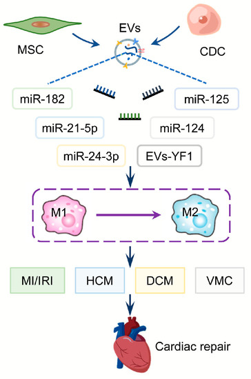 Figure 2. Macrophage polarization associated therapeutical EVs-ncRNAs in CVD. MSC or CDC-derived EVs regulate the transition from M1 to M2 polarization of macrophages by delivering ncRNAs such as miR-182, miR-21-5p, miR-24-3p, miR-124, miR-125, and YF1. These EVs-ncRNAs can protect the heart against MI/IRI, HCM, DCM, and VMC by regulating macrophage polarization. Abbreviations: MSC: mesenchymal stem cell; CDC: cardio-sphere derived cell; EVs: extracellular vesicles; YF1: Y RNA fragment 1; MI/IRI: myocardial infarction/ischemia-reperfusion injury; HCM: hypertrophic cardiomyopathy; DCM: diabetic cardiomyopathy; VMC: viral myocarditis.