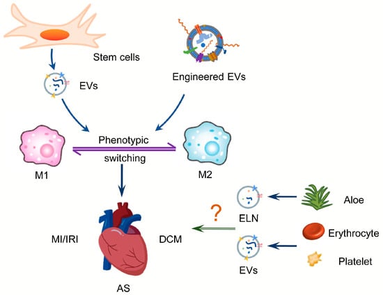 Figure 3. A role for EVs in the treatment of CVD by acting on macrophages. Stem cell-derived EVs or engineered EVs can protect the heart against MI/IRI, DCM, and AS by regulating macrophage polarization. In addition, the effect of nanoparticles derived from plants, erythrocytes, and platelets on macrophage polarization still needs further investigation. Abbreviations: MI/IRI: myocardial infarction/ischemia reperfusion injury; DCM: diabetic cardiomyopathy; AS: atherosclerosis; ELN: exosome-like nanovesicles.