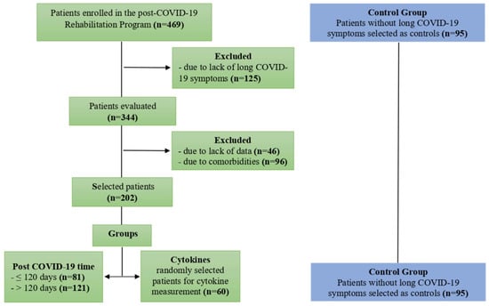 Non-probabilistic intentional sampling was used to select participants. The sample of 297 participants who had recovered from acute COVID-19 comprised 202 individuals with long COVID symptoms, and 95 individuals without symptoms as controls (Figure 1). Based on the symptom duration, the participants with long COVID were divided into ≤120 days (n = 81) and >120 days (n = 121) groups. To assess the cytokine profiles of participants with long COVID, blood samples were collected from a convenience sample of 155 patients and divided into two groups: long COVID (n = 60) and controls (n = 95). Demographic and clinical data were collected, including sex, age, height, weight, body mass index (BMI) [23], hospitalization, and length of stay.
