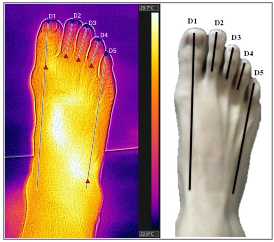 Thermograms were analysed using the FLIR Tools+ software version 6.4 (FLIR System, Stockholm, Sweden). The measurements were made by adding measurement lines that provided the maximum, average and minimum temperatures of each demarcated area. For this research, we used only the average temperatures provided by this software, using the “rainbow” side palette. Five regions of interest (ROIs) were analysed on the dorsal surface. Region D1 corresponds to the distal end of the first toe to the navicular bone; regions D2, D3, and D4 correspond to the distal extremity of the toes up to the metatarsophalangeal joint of the second, third, and fourth toes, respectively; and D5 region corresponds to the distal end of the fifth toe to the cuboid bone (Figure 2).