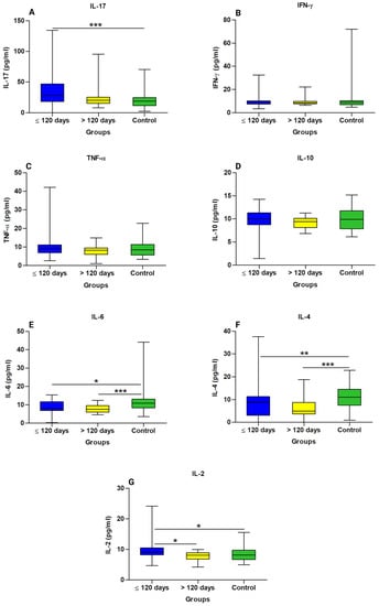 An assessment of cytokine levels between the groups showed higher levels of IL-17 (Figure 3A) and IL-2 (Figure 3G) in patients in the ≤120 days; IL-6 (Figure 3E) and IL- 4 (Figure 3F) were higher in the control group than in the other groups. The levels of the cytokines IFN-γ (Figure 3B), TNF-α (Figure 3C), and IL-10 (Figure 3D) did not differ significantly according to the group.
