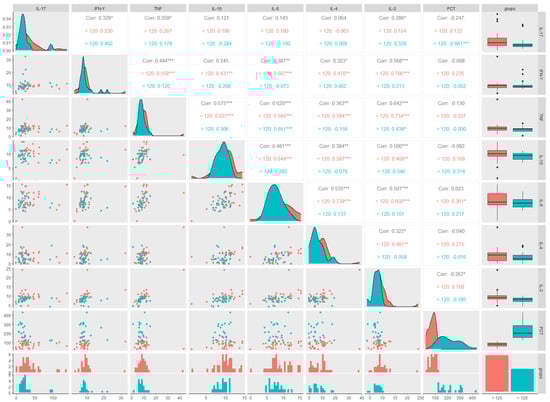 A linear correlation analysis was applied to the variables IL-17, IFN-γ, TNF-α, IL-10, IL-6, IL-4, IL-2, and PCT, in general and stratified by the two groups, ≤120 days (represented by the red colour) and >120 days (represented by the green colour), through the correlation matrix (Figure 4). It presented Spearman’s linear correlation coefficient, the data distribution curve graph, the data dispersion graph, the histogram, the boxplot, and the statistical significance indicated by the presence of an asterisk for each pair of variables. Patients with a PCT ≤120 days showed a positive correlation with IL-6 levels, whereas those with a PCT >120 days showed a negative correlation with IL-17 levels. A correlogram of the total PCT (15 months) revealed a positive correlation for most of the cytokines analysed, in addition to the positive correlation between IL-2 levels and PCT.