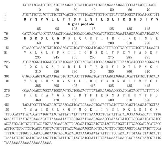 Nucleotide sequence and deduced amino acid sequence of the leptin gene of Elopichthys bambusa. The sense strand is displayed from the 5′ to 3′ direction. Stop codons are marked with “*” in the nucleotide sequence. Signal peptides are marked in bold letters. The GenBank accession number is MW794324.