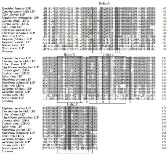 Sequence alignment shows that the amino acid sequence of leptin was conserved in cyprinid fish, such as yellow cheek carp (Elopichthys bambusa), grass carp (Ctenopharyngodon idella), Megalobrama amblycephaloid, common carp (Cyprinus carpio), and crucian carp (Carassius gibelio), but had a large difference from the sequences of non-cynic fishes and other vertebrates. However, the secondary structure of leptin proteins from various animals was highly conserved, with four α-helices (Helix A–D) (Figure 2)
