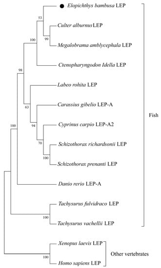Leptin is a product of the obesity gene, which was identified by positional cloning technology [1]. Leptin is secreted by the adipose tissue in mammals and is considered an anorexia hormone [2,3,4]. The physiological role and regulatory mechanism of leptin have been extensively studied in many animals [5,6,7,8,9]. In mammals, leptin can reduce feeding and increase energy consumption through the regulation of feedback in the hypothalamic–pituitary axis [10]. In frogs (Xenopus laevis), leptin can influence limb growth and differentiation during early development [7]. In chickens, the expression of leptin and its receptor were detected in the brain and digestive tract [8], which suggests that leptin may be involved in brain and digestive tract-related functions. In Anolis carolinensis, leptin can ameliorate immunity [9]. In fish, leptin was first identified in Takifugu rubripes [11]. At present, leptin has been cloned from many species of fish, such as grass carp (Ctenopharyngodon idella), common carp (Cyprinus carpio), zebrafish (Barchydanio rerio), mandarin fish (Siniperca chuatsi), and orange-spotted grouper (Epinephelus coioides) [12,13,14,15,16]. Previous studies have shown that leptin plays a role in regulating food intake, glucose and lipid metabolism, reproduction, and immunity in fish [12,14,17,18,19,20]. Since teleost fishes exhibit a remarkable level of anatomical, ecological, behavioral, and genomic diversity, the structure and function of leptin may also vary considerably between fish species [21]. However, leptin from yellow cheek carp (Elopichthys bambusa) has not been cloned so far. Cloning of the leptin gene of yellow cheek carp is helpful to enrich the basic data of leptin in fishes, and provides reference material for further functional research on yellow cheek carp.
