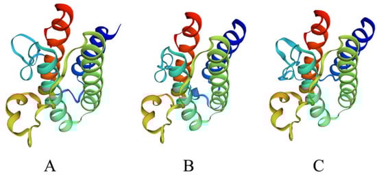 Tertiary structure model of Leptin predicted from amino acid sequences. (A) Yellow Cheek Carp, (B) Human, (C) Grass Carp.