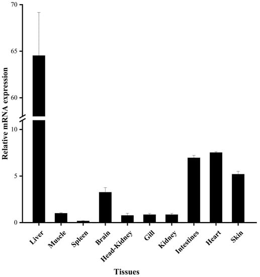 The mRNA tissue expression levels of EbLep were analyzed by real-time PCR. The results show that EbLep can be expressed in liver, intestine, spleen, kidney, heart, gill, brain, head kidney, skin, and muscle. The mRNA expression level in the liver tissue was the highest, which was more than eight times that of other tissues. This was followed by the heart, intestine, skin, brain, muscle, kidney, gill, head, kidney, and spleen (Figure 5).
