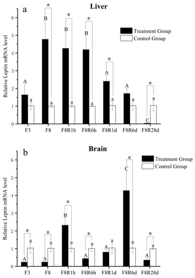Relative Expression of EbLep mRNA in the liver (a) and brain (b) under fasting and refeeding. F3 and F8 indicate fasting for 3 and 8 days, respectively. F8R1h, F8R6h, F8R1d, F8R6d, and F8R28 indicate refeeding for 1 h, 6 h, 1 day, 6 days, and 28 days after 8 days of fasting, respectively. Significant differences among treatment groups (ANOVA, p < 0.05) are indicated by different capital letters (A, B, and C); no significant differences among control groups (ANOVA, p > 0.05) are indicated by different lowercase letters (a); and significant differences between control and treatment groups (ANOVA, p < 0.05) are indicated by *.