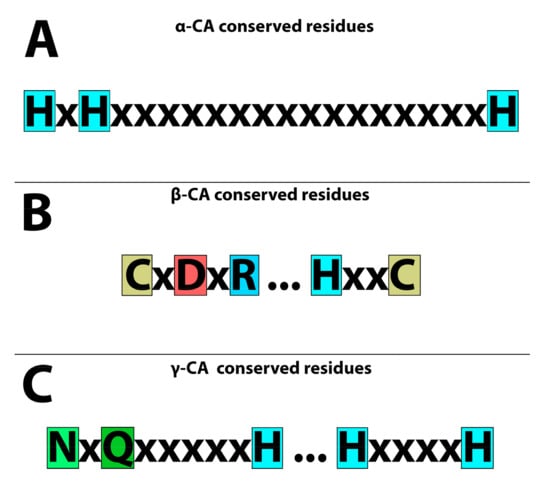Conserved residues of CAs in the catalytic active sites. (A) Three “H” histidines are highly conserved in α-CAs. (B) Two cysteines “C”, one histidine “H”, one aspartic acid “D”, and one arginine “R” are highly conserved amino acids in β-CAs. (C) Three histidine residues “H”, one asparagine “N”, and one glutamine “Q” are highly conserved amino acids in γ-CAs.