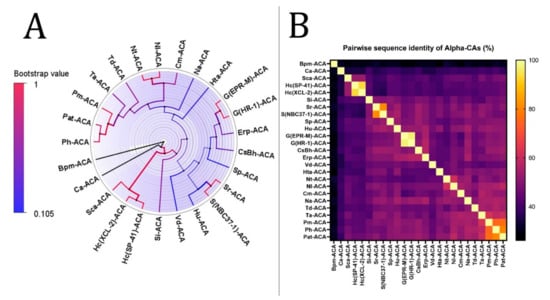 Phylogenetic analysis of α-CAs from the thermophilic microbiome of hydrothermal vents. (A) The tree’s branches and nodes were colored based on bootstrap values (0–1), and the bacterial CAs and archaea were highlighted with blue and orange, respectively, via FigTree V1.4.4 software. (B) α-CA pairwise sequence identity heatmap. The heatmap for the all-versus-all pairwise sequence identity of α-CA calculations was generated using T-Coffee MSA. Pairwise sequence identity values are colored from yellow (highest) to black (lowest).