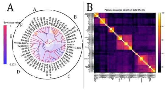 The phylogenetic tree of β-CAs with the highest log-likelihood (−15,146.85) is shown in Figure 3. Initial trees for the heuristic search were obtained automatically by applying neighbor-joining and BioNJ algorithms to a matrix of pairwise distances estimated using the JTT model and then selecting the topology with a superior log-likelihood value. A discrete gamma distribution was used to model evolutionary rate differences among sites (two categories (+G, parameter = 2.7462)). The rate variation model allowed some sites to evolve invariably ([+I], 0.97% sites). This analysis involved 55 β-CA amino acid sequences. There were a total of 308 positions in the final dataset. Based on bootstrap values and identity, we divided this tree (Figure 3) into six clades from A to F. The analysis revealed that there is a common ancestor between the β-CAs in each clade.