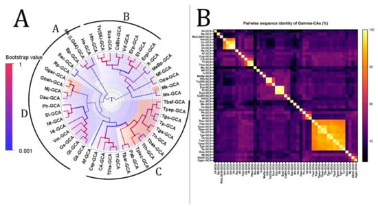 The phylogenetic tree of γ-CAs with the highest log-likelihood (−9786.77) is shown in Figure 4. The initial phylogenetic trees for the heuristic search were automatically obtained by applying Neighbor-Join and BioNJ algorithms to a matrix of pairwise distances estimated using the JTT model. The topology with a superior log-likelihood value was then selected. A discrete gamma distribution was used to model evolutionary rate differences among sites (two categories (+G, parameter = 1.6179)). The variation model rate allowed some sites to evolve invariably ([+I], 3.65% sites). Forty-seven amino acid sequences were involved in this analysis. There were a total of 219 positions in the final dataset. We divided this tree into four clades from A to D based on bootstrap values and identity, similar to the β-CA phylogenetic analysis. The analysis revealed that there is a common ancestor between the γ-CAs in each clade.