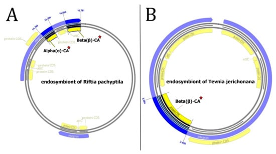 According to data analysis by Integron Finder, the endosymbiont of Riftia pachyptila contains two integrons. The first integron has one CDS, and the second has two attC sites; the CALIN type has six CDSs, an α-CA gene on the fourth CDS, and a β-CA gene on the sixth CDS (Figure 5A). The endosymbiont of Tevnia jerichonana has one integron with two attC sites, six CDS is CALIN type, and a β-CA gene on the fourth CDS (Figure 5B).