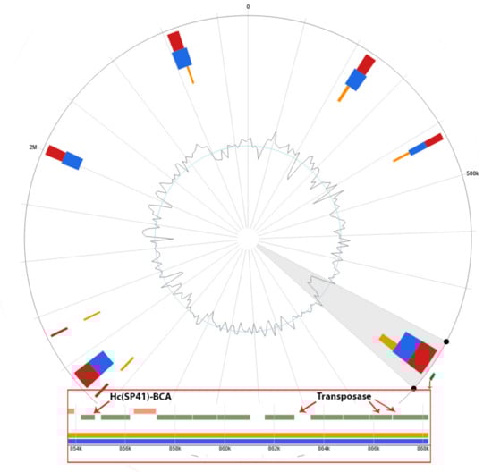GIs of Hydrogenovibrio crunogenus SP-41. Hc(SP41)-BCA and transposase genes are marked green and shown in the red box. The GC content is visible at the center of the figure.