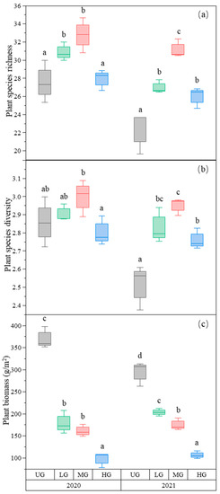 Box plot of plant species richness (a); plant species diversity (b); and plant biomass (g/m2) (c) for the nongrazing (UG), light (LG), moderate (MG), and heavy (HG) grazing treatments. The error bars represent the standard error; the letters represent the significant differences (p < 0.05).