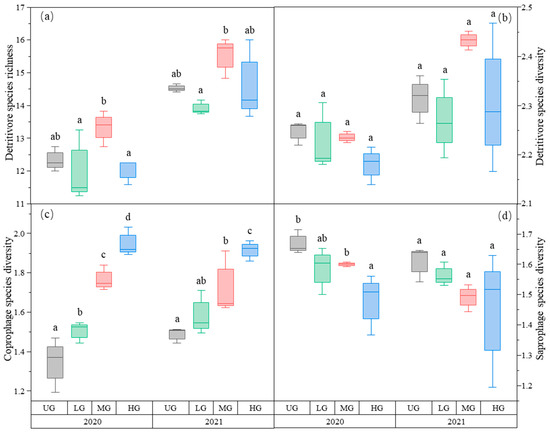 Box plot of detritivore species richness (a); detritivore species diversity (b); coprophage species diversity (c); and saprophage species diversity (d) of the nongrazing (UG), light (LG), moderate (MG), and heavy (HG) grazing treatments in 2020 and 2021. The error bars in the figure represent the standard error, and the letters represent the significant differences (p < 0.05).