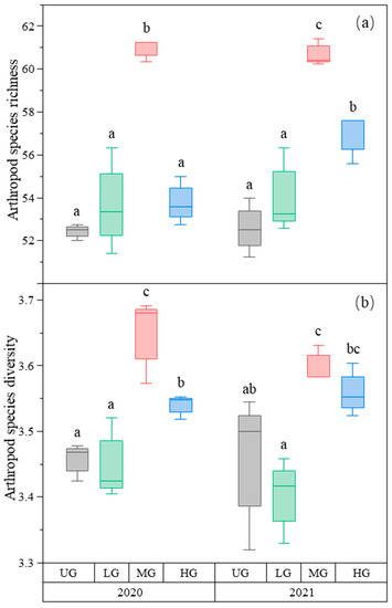Box plot of arthropod species richness (a) and species diversity (b) for nongrazing (UG), light (LG), moderate (MG), and heavy (HG) grazing treatments in 2020 and 2021. The error bars in the figure represent the standard error, and the letters represent the significant differences (p < 0.05).