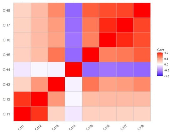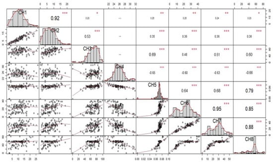 Heat map analysis of correlation coefficient exhibiting the extent of association among various parameters (CH1: number of eggs laid; CH2: number of adults emerged; CH3: percent adult emergence; CH4: mean development period; CH5: growth index; CH6: percent weight loss at 30 days; CH7: percent weight loss at 60 days; CH8: percent weight loss at 90 days).