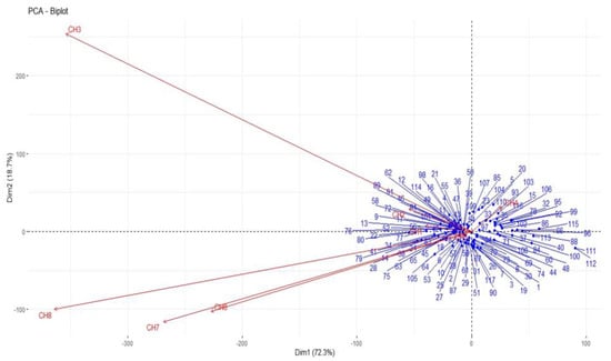 Genotype by trait biplot analysis indicating the association among various traits and plotting of genotypes based on principle components (PCs). PC1 and PC2 explained 72.3% and 18.7% variation, respectively. PRR2008-2 (G111) and PRR2008-2-sel (G112) belong to V. umbellata clustered together as highly resistant.