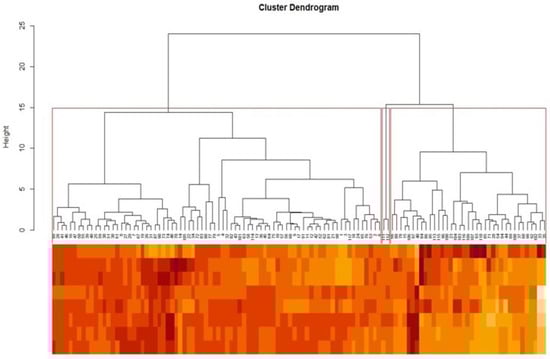 The four principal components (PC1 to PC4) explained about 99% of the genetic variation. Among these four PCs, two PCs with latent roots >1.00 (PC1 and PC2) accounted for about 91% of the total variation, whereas, individually, PC1 and PC2 covered 72.30% and 18.70% of variation, respectively (Figure 5). The cluster analysis of all 117 genotypes clearly distinguished them among three broad categories: HR (group I), R to MR (group II) and S to HS (group III), presented in Figure 6. The two wild genotypes, namely PRR 2008-2 (V. umbellata) and PRR 2008-2-sel (V. umbellata), grouped together, exhibiting a highly resistant response. Likewise, all the resistant to moderately resistant genotypes, such as TCR-93 (V. umbellata), EC550831 (V. radiata), EC520024 (V. radiata), EC520026 (V. radiata), TCR-7 (V. sublobata) and W-17 (V. stipulacea), grouped together in one cluster, whereas all the susceptible and highly susceptible genotypes fell into a separate cluster.
