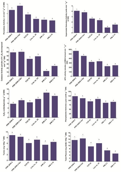 Many antioxidants and detoxifying enzymes are reported to play major roles in stress tolerance [], but the roles in bruchid resistance in wild species are not well understood. Understanding the biochemical mechanisms of plant resistance could be utilized in exploiting the trait in crop breeding. The present study investigated the expression of antioxidants and detoxifying enzymes in two Vigna species (V. radiata, V. umbellata) upon bruchid oviposition. The selected genotypes were subjected to antioxidant enzyme analysis. The SOD, POD, CAT and APX activities were recorded to be significantly higher in PRR 2008-2 and PRR 2008-2-sel (V. umbellata) as compared to other cultivated ricebean and mungbean, indicating their basal expression in the seeds. The present finding is in conformity with the findings of Mallikarjun et al. []. There was significant variation in the expression of H2O2 in the fresh seeds and infected seeds from C. chinensis of different Vigna genotypes both under control and C.-chinensis-infected seeds. The relatively lower expression of H2O2 was found in PRR 2008-2 seeds as compared to susceptible seeds. Sofo et al. [] suggested that, at low expression, H2O2 acts as a signal molecule involved in the regulation of specific biological and physiological processes. Since stress factors provoke enhanced production of H2O2 in plants, severe damage to biomolecules can be possible due to elevated and non-metabolized cellular H2O2. Plants are endowed with H2O2-metabolizing enzymes, such as CAT, APX, etc. The PAL, tanin and phenolics were upregulated in the wild resistant genotypes, whereas lower expression was noticed in the cultivated susceptible genotypes. The present study revealed that the strong defence response activated upon the bruchid oviposition in all the wild ricebean genotypes might be a basis for the bruchid resistance in Vigna species. These wild accessions, i.e., PRR 2008-2, PRR 2008-2-sel, TCR-93 and L-24, may be further utilized in breeding programmes for improving the resistance towards bruchid in mungbean.