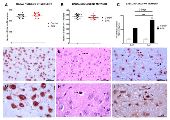 BPA effects in Wistar rats’ nucleus basalis of Meynert’s NeuN+, ChAT+, and necrotic (ChAT−/ChAT+) neurons after acute (40 µg/kg) exposure (A–C). Data represent the mean (n = 6 animals for control and treatment groups) ± SD of the number of total NeuN neurons (A), total ChAT+ neurons (B), and the percentage variation of ChAT−/ChAT+ necrotic neurons (C) compared to control. Three sections were used per nuclei. At least 3 replicates of each type of neuron counting were performed. Two way-ANOVA (treatment vs. type of neuron comparison) or Student’s t-test (control vs. treatment comparison). *** p < 0.001 compared to control (C); ### p < 0.001 compared to ChAT− necrotic neurons (C). (D–I) show Wistar rat’s nucleus basalis of Meynert’s photomicrographs. NeuN immunohistochemical stain highlights NeuN+ mature neurons in (D,G) (20× and 40× magnification, respectively, scale bar = 1000 μm) and ChAT immunohistochemical stain highlights ChAT+ cholinergic neurons in (F,I) (20× and 40× magnification, respectively, scale bar = 1000 μm). (E,F,H,I) show BPA acute exposure effects, illustrating ChAT+ necrotic neurons (arrows or circle) in (F,I) (20× and 40× magnification, respectively, scale bar = 1000 μm), and necrotic neurons (arrows) in (E,H) (H-E, scale bar = 1000 μm, 20× and 40× magnification, respectively) adjacent to more normal neurons. (E,H) depict acute eosinophilic neuronal necrosis, with noticeable eosinophilia of the cytoplasm and basophilia of the nucleus.
