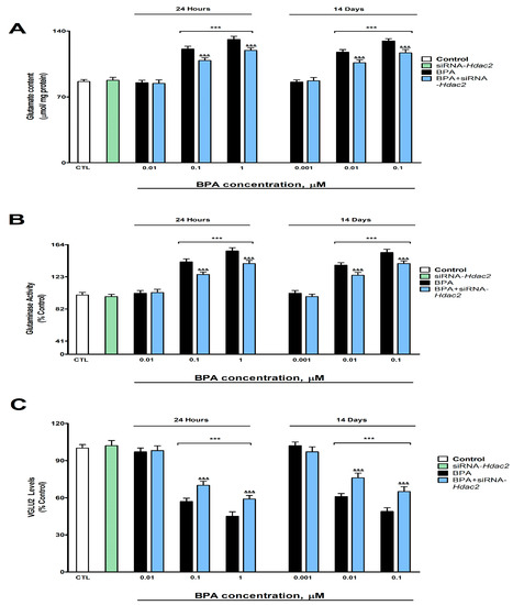 (A) Glutamate concentration, (B) glutaminase function, and (C) VGLUT2 levels. The absolute control value of VGLUT2 protein levels was 26.31 ± 0.87 ng/g. Results show the mean (n = 9) ± SEM of three independent experimental conditions from cells of different cultures, each developed in triplicate. There were no significant differences between controls treated with and without a vehicle, cells transfected without siRNA or with scramble siRNA, or cells transfected with or without siRNA and treated with a vehicle in any of the targets studied. The data shown in the figures represent control treated with vehicle and transfected without siRNA as 100%. One-way (treatment-response comparisons) and two-way (transfection/treatment comparisons) ANOVA analyses followed by Tukey post-hoc test were developed to determine statistically significant differences between treatments. *** p ≤ 0.001, significantly different from controls; &&& p ≤ 0.001 contrasted with BPA exposure.