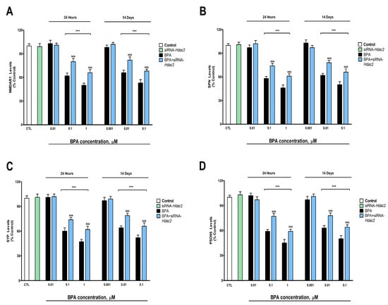 (A) NMDAR1, (B) SPN, (C) SYP, and (D) PSD95 levels. The absolute control values of NMDAR1, SPN, SYP, and PSD95 protein levels were 40.81 ± 1.31 ng/g, 26.12 ± 0.88 ng/g, 17.5 ± 0.57 ng/g, and 30.91 ± 1.05 ng/g, respectively. Results show the mean (n = 9) ± SEM of three independent experimental conditions from cells of different cultures, each developed in triplicate. There were no significant differences between controls treated with and without a vehicle, cells transfected without siRNA or with scramble siRNA, or cells transfected with or without siRNA and treated with a vehicle in any of the targets studied. The data shown in the figures represent control treated with vehicle and transfected without siRNA as 100%. One-way (treatment-response comparisons) and two-way (transfection/treatment comparisons) ANOVA analyses followed by Tukey post-hoc test were developed to determine statistically significant differences between treatments. *** p ≤ 0.001, significantly different from controls; &&& p ≤ 0.001 contrasted with BPA exposure.