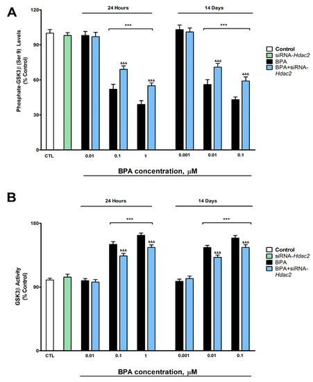 (A) p-GSK3β (Ser9) levels, and (B) GSK3β activity. Results show the mean (n = 9) ± SEM of three independent experimental conditions from cells of different cultures, each developed in triplicate. There were no significant differences between controls treated with and without a vehicle, cells transfected without siRNA or with scramble siRNA, or cells transfected with or without siRNA and treated with a vehicle in any of the targets studied. The data shown in the figures represent control treated with vehicle and transfected without siRNA as 100%. One-way (treatment-response comparisons) and two-way (transfection/treatment comparisons) ANOVA analyses followed by Tukey post-hoc test were developed to determine statistically significant differences between treatments. *** p ≤ 0.001, significantly different from controls; &&& p ≤ 0.001 contrasted with BPA exposure.