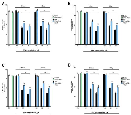 (A) WNT3a, (B) β-catenin, (C) c-Myc, and (D) cyclin D1 levels. The absolute control values of WNT3, β-catenin, c-Myc, and cyclin D1 protein content were 11.31 ± 0.21 ng/g, 22.14 ± 0.34 ng/g, 14.1 ± 0.52 ng/g, and 8.2 ± 0.31 ng/g, respectively. Results show the mean (n = 9) ± SEM of three independent experimental conditions from cells of different cultures, each developed in triplicate. There were no significant differences between controls treated with and without a vehicle, cells transfected without siRNA or with scramble siRNA, or cells transfected with or without siRNA and treated with a vehicle in any of the targets studied. The data shown in the figures represent control treated with vehicle and transfected without siRNA as 100%. One-way (treatment-response comparisons) and two-way (transfection/treatment comparisons) ANOVA analyses followed by Tukey post-hoc test were developed to determine statistically significant differences between treatments. *** p ≤ 0.001, significantly different from controls; &&& p ≤ 0.001 contrasted with BPA exposure.