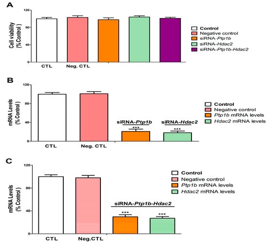 Hdac2 and/or Ptp1b silencing efficiency and effect on cell viability. Positive and negative control (transfection without or with scrambled siRNA). Hdac2-siRNA, Ptp1b-siRNA, and Ptp1b-Hdac2-siRNA (transfection with siRNA against Hdac2, Ptp1b, or Ptp1b-Hdac2). The MTT absolute control value of absorbance at 562 nm was 0.80 ± 0.018. MTT analysis (A). Hdac2 and Ptp1b gene expression analysis (B,C). Data show the mean (n = 9) ± SEM of three independent experiments from cells of different cultures, each developed in triplicate. There were no significant differences between controls treated with and without a vehicle, cells transfected without siRNA or with scramble siRNA, or cells transfected with or without siRNA and treated with a vehicle in any of the targets studied. The data shown in the figures represent control treated with vehicle and transfected without siRNA as 100%. One-way (treatment-response comparisons) and two-way (transfection/treatment comparisons) ANOVA analyses followed by Tukey post-hoc test were developed to determine statistically significant differences between treatments. *** p ≤ 0.001, significantly different from controls.