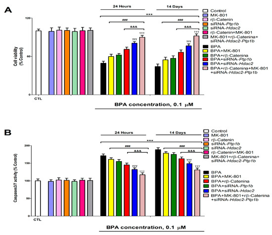 BPA (0. 1 µM) cell viability (A) and apoptosis (B) effects on transfected or non-transfected SN56 cells with siRNA against Hdac2 and/or Ptp1b either alone or in combination with MK-801 (20 µM) and/or rβ-Catenin (15 µM) following 1- or 14-days. The data represent the mean (n = 9) ± SEM of three separate experiments from cells of different cultures, each of them performed in triplicate. There were no significant differences between controls treated with and without a vehicle, cells transfected without siRNA or with scramble siRNA, or cells transfected with or without siRNA and treated with a vehicle in any of the targets studied. The data shown in the figures represent control treated with vehicle and transfected without siRNA as 100%. One-way (treatment-response comparisons) and two-way (transfection/treatment comparisons) ANOVA analyses followed by Tukey post-hoc test were developed to determine statistically significant differences between treatments. *** p ≤ 0.001 compared to the control; ### p ≤ 0.001 compared to BPA treatment; &&& p ≤ 0.001 compared to BPA co-treatment with rβ-Catenin; γγγ p ≤ 0.001 compared to BPA treatment of Ptp1b silenced cells; τττ p ≤ 0.001 compared to Hdac2 knockdown cells exposed to BPA.