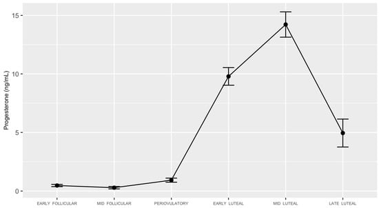 LH surges were captured in 22 out of the 28 (~78%) participants. This rate is similar to the findings of Mumford et al. [], which validated the study methodology that we implemented in the present study as well as in our previous publication []. The mean and standard deviation periovulatory serum luteinizing hormone values in the 22 participants were 35.63 (14.26) IU/L. Values of progesterone for the 28 participants across the menstrual cycle are depicted in Figure 1.