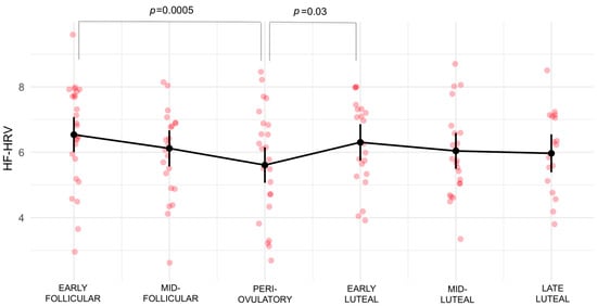 The ICC of the unconditional means null model (model 0) showed that, of the total variance in HF-HRV, 68.86% was attributable to between-person variation. Including the subphase as a fixed effect term in the next model (model 1) indicated a significant effect of the subphase (p = 0.001831) and resulted in the following change from the intercept (β= 6.5380) (i.e., relative to the early follicular subphase, coded as 0): (1) mid-follicular (β = −0.4203, p = 0.0605); (2) periovulatory (β = −0.9302; p = 3.6 × 10−6); (3) early luteal (β = −0.2347, p = 0.2989); (4) mid-luteal (β = −0.4969, p = 0.0256); and (5) late luteal (β = −0.5709, p = 0.0201). The analysis of variance comparison showed a high statistical significance between models 0 and 1 (p < 2 × 10−16). The quantile plot (Supplementary Figure S1) did not raise significant concerns regarding the normality of the weighted residuals. The ICC for model 1 was 72.14%. Pairwise comparisons of all the timepoints in model 1, with the Tukey method for comparing a family of six subphase estimates, showed statistically significant differences in HF-HRV between the early follicular and periovulatory subphases (β = 0.9302; p = 0.0005) and between the periovulatory and early luteal subphases (β = −0.6955; p = 0.0367). The full results of pairwise comparisons are presented in Table 2 and depicted in Figure 2. Restricting the analysis to healthy participants also only showed a statistically significant decrease in the periovulatory subphase of the menstrual cycle relative to the early follicular subphase. These results are presented in the Supplementary Materials.