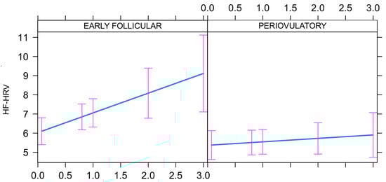 Model 2, which included main and interactive fixed effects of the subphase (early follicular and periovulatory), and which included individuals as random effects, demonstrated the following fixed effects findings: (1) progesterone (β = 1.0286; p = 0.0106); (2) subphase (periovulatory vs. early follicular) (β = −0.6613; p = 0.0392); and (3) subphase: progesterone interaction (periovulatory: progesterone vs. early follicular: progesterone) (β = −0.8487; p = 0.0350). As shown in Figure 3, the relationship between the predictor (progesterone) and the outcome (HF-HRV) was significantly different for the early follicular vs. periovulatory subphase.