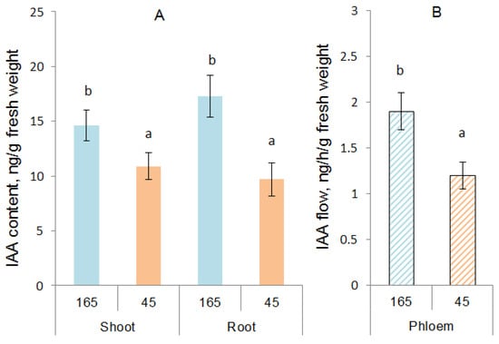 The content of IAA calculated per g of fresh weight of shoots and roots (A), and phloem flux of IAA (ng h−1 g−1 of leaf fresh weight) (B) of barley plants grown during one day at different illumination levels (165 vs. 45 µmol m−2 s−1 PAR). Statistically different means are marked with different letters (ANOVA, Duncan test at p < 0.05; n = 9).