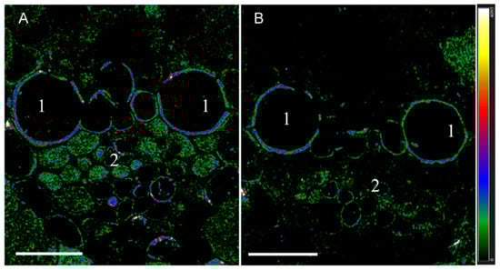 Immunohistochemical localization of IAA in vascular bundles of leaves of barley plants after their growing during one day at various levels of illumination. Images were taken from 10 independent sections per treatment and figure shows representative images. Intensity of fluorescence is displayed as a color-coded heatmap. (A)—control (165 µmol m−2 s−1), (B)—reduced illumination (45 µmol m−2 s−1). Scale bar 20 µm, 1—xylem, 2—phloem.