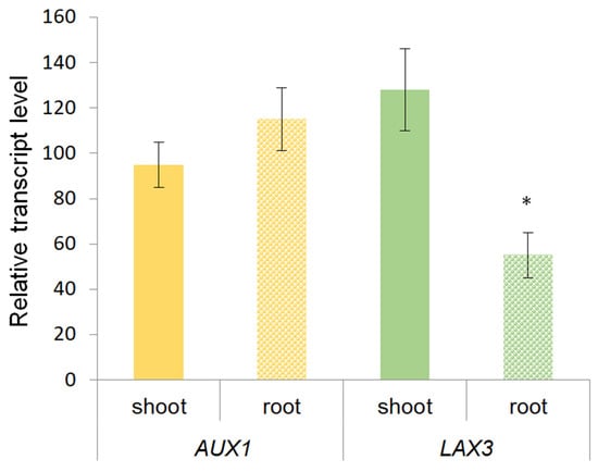 However, as in the case of PIN carriers, which were previously analyzed in wheat plants [8], no significant differences were found between the low-light and high-light plants in terms of AUX1 and LAX3 gene transcripts in the shoots (Figure 3). At the same time, as in the case of the PIN gene, the abundance of LAX transcript was lower in the roots of plants grown under low light conditions compared to the control.