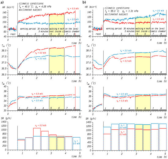 Time course of heart rate (HR), rectal (Tre) and mean skin temperature (Tsk), and sweat rate (SR) of an acclimated participant during experiments in a hot−humid climate (a) or in a hot−dry climate (b) under both reference (va = 0.3 m/s, red lines) and high air velocity (va = 2 m/s, blue lines) conditions. The yellow shaded area marks the time interval with averaged values used for analyses. Note that the reference wind trial in (a) was prematurely aborted in the 8th working period.