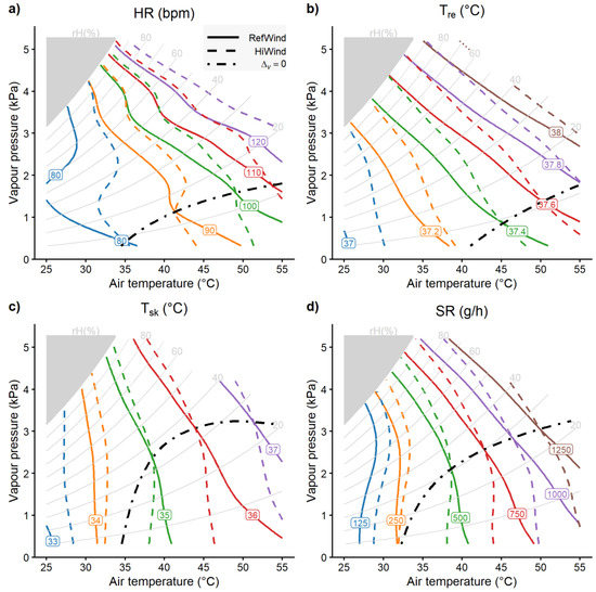 The dot-dashed lines represent the zero wind effect Δv = 0, thus demonstrating that the threshold separating cooling from heating effects was bended upward to the right, resemblingthe UTCI (Figure 3b), but with a greater curvature. They indicated reduced heat strain with HiWind at low temperatures and in hot–humid conditions, with limiting vapor pressure above 2 kPa for HR and Tre and above 3 kPa for Tsk and SR, respectively.