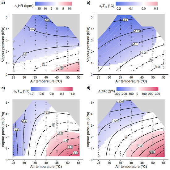 Difference plots with contours of the wind effects (ΔV) estimated by GAMs in relation to air temperature and vapor pressure for (a) heart rates (HR), (b) rectal temperatures (Tre), (c) mean skin temperatures (Tsk), and (d) sweat rates (SR). White areas indicate temperature−humidity regions with non−significant wind effects (p > 0.05 testing for Δv = 0 vs. Δv ≠ 0), the blueish areas mark significant reductions in physiological strain by wind cooling, while reddish areas depict significantly increased strain levels due to heating wind effects, respectively. Dashed lines show relative humidity levels, and the gray shaded areas indicate combinations not supported by data. Experimental conditions are marked by ‘+’ (RefWind) and ‘×’ (HiWind), respectively.