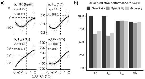 (a) Correlation of wind effects from Figure 5 for heart rate (ΔvHR), rectal temperature (ΔvTre), mean skin temperature (ΔvTsk), and sweat rate (ΔvSR), respectively, with the wind effect on UTCI (ΔvUTCI), shown in Figure 3b, calculated for the temperature–humidity combinations of the experiments (cf. Figure 5). Spearman correlations (rs) and p−values are shown with smoothing splines and 95% confidence bands. Dashed vertical and horizontal lines indicate zero wind effects (Δv = 0) for UTCI and the physiological responses, respectively, where negative values (Δv < 0) indicate wind cooling and positive values (Δv > 0) heating effects. (b) UTCI performance in predicting heating wind effects (Δv > 0) on HR, Tre, Tsk, and SR, respectively, expressed by sensitivity, specificity and accuracy.
