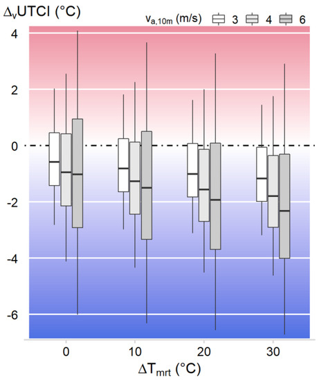 Figure A3 in Appendix A visualizes the wind effects (Δv) on the UTCI over the temperature–humidity grid for the different wind speeds and radiant heat loads, expressed as ΔTmrt = Tmrt – Ta, with the upper left panel with va,10m = 3 m/s and ΔTmrt = 0 K repeating the data from Figure 3b. Figure 7 summarizes the wind effects ΔvUTCI depending on the wind speed and radiant heat load as boxplots calculated over the temperature–humidity grid.