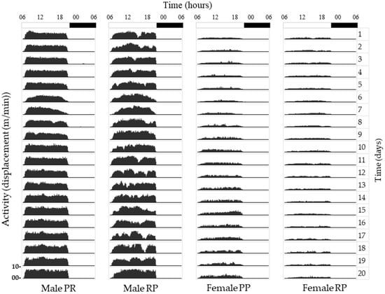 Actograms of the average activity–rest cycle for each ”protoptypical” individual of the four groups (a male and female during the pre-reproductive (PP) and reproductive period (RP). The first bar represents the hours of darkness (in black). Note that regardless of the period, males always showed higher activity than females.