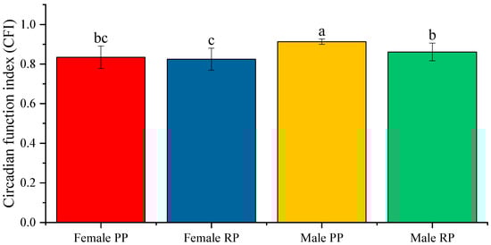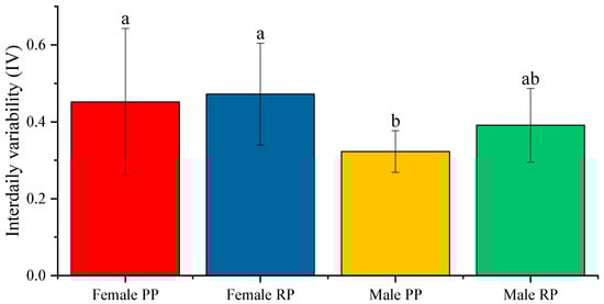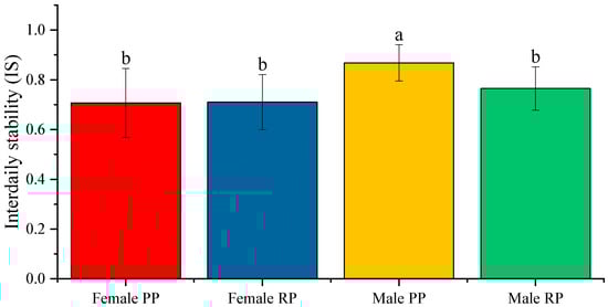 Average value of the interdaily stability (IS) in male and female fish before the reproductive period (PP) and during the reproductive period (RP). The data represented are the mean of each group ± SD; n = 28 female fish and 30 male fish. Different letters indicate statistically significant differences. The intervals above each bar represent the standard deviation.