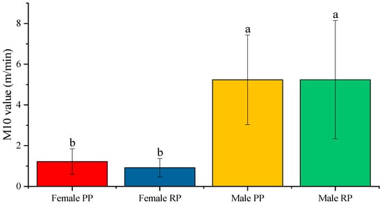 In the case of females, differences were observed between both periods but they were not statistically significant; the average value before and during reproduction was 1.217 ± 0.118 m/min and 0.913 ± 0.086 m/min, respectively (Figure 5). When comparing the sexes during the pre-reproduction period, the females presented an average value of M10, which was statistically lower than that of the males (Figure 5). The same occurred during the reproduction period, presenting a higher mean value of M10 in males than in females.