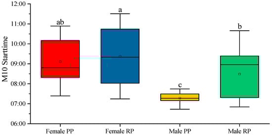 M10 start time of the activity–rest circadian rhythm in male and female fish before and during the reproduction period. The data represented are the mean of each group ± SD, n = 30 male fish and 28 female fish. Different letters indicate statistically significant differences. The intervals above each bar represent the standard deviation.